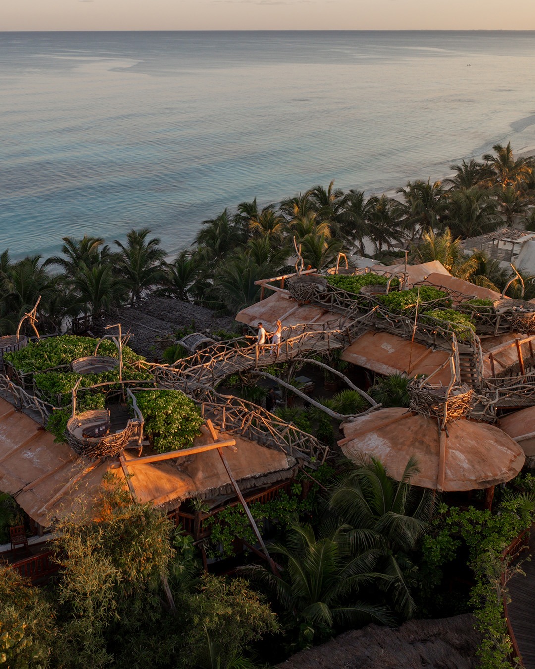 Este complejo solo para adultos es una experiencia en sí misma: las pasarelas en las copas de los árboles, los pasillos secretos, las escaleras de madera, los portales naturales y los nidos de escala humana crean un ambiente de un templo mítico escondido en la selva.