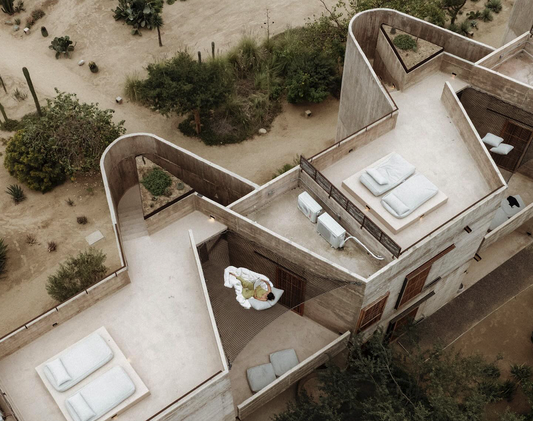 Diseñado por Yashar Yektajo y Rubén Valdez, Paradero se define por un brutalismo cálido que nace del territorio. Muros sobrios, materiales locales, jardines comestibles y pasajes abiertos permiten que la luz, el viento y el silencio guíen la experiencia. El interiorismo, a cargo de Bibiana Huber, refuerza esta conexión a través de una estética serena y táctil, mientras que el paisajismo de Polen Paisaje integra el entorno natural como parte esencial del proyecto. En las suites superiores, redes tensadas invitan a observar el cielo estrellado, suspendido entre el desierto y la calma.
