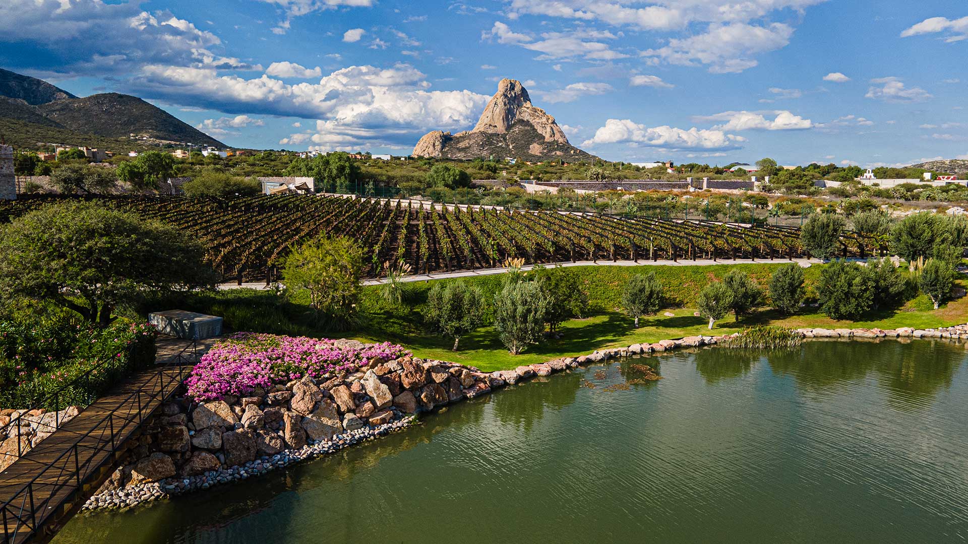 Ahí, en los valles de Ezequiel Montes, a pocos minutos del Pueblo Mágico de Bernal, se levanta Puertas de la Peña, un espectacular concepto de viñedo boutique inaugurado en 2014 como espacio para eventos, con una elegante capilla; pero que en 2019 fue robustecido con las instalaciones necesarias para producir vino y un pequeño lago que transformaron completamente su imagen para convertirlo en una verdadera casa vitivinícola de primer nivel, que también ofrece los servicios de hospedaje, restaurante y spa, con las mejores vistas a los campos de uva de la región y a la popular Peña de Bernal, el enigmático monolito de más de 400 metros de altura que domina el paisaje de esta región en la parte media de Querétaro.